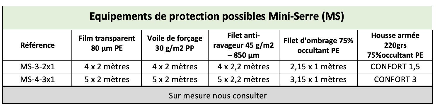 Plusieurs types de protections sont adaptables : housse transparente armée, voile de forçage, film transparent, filet anti-ravageurs (limaces, insectes, oiseaux) et filet d’ombrage.